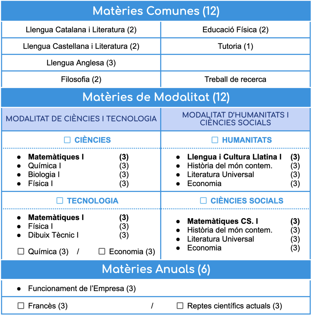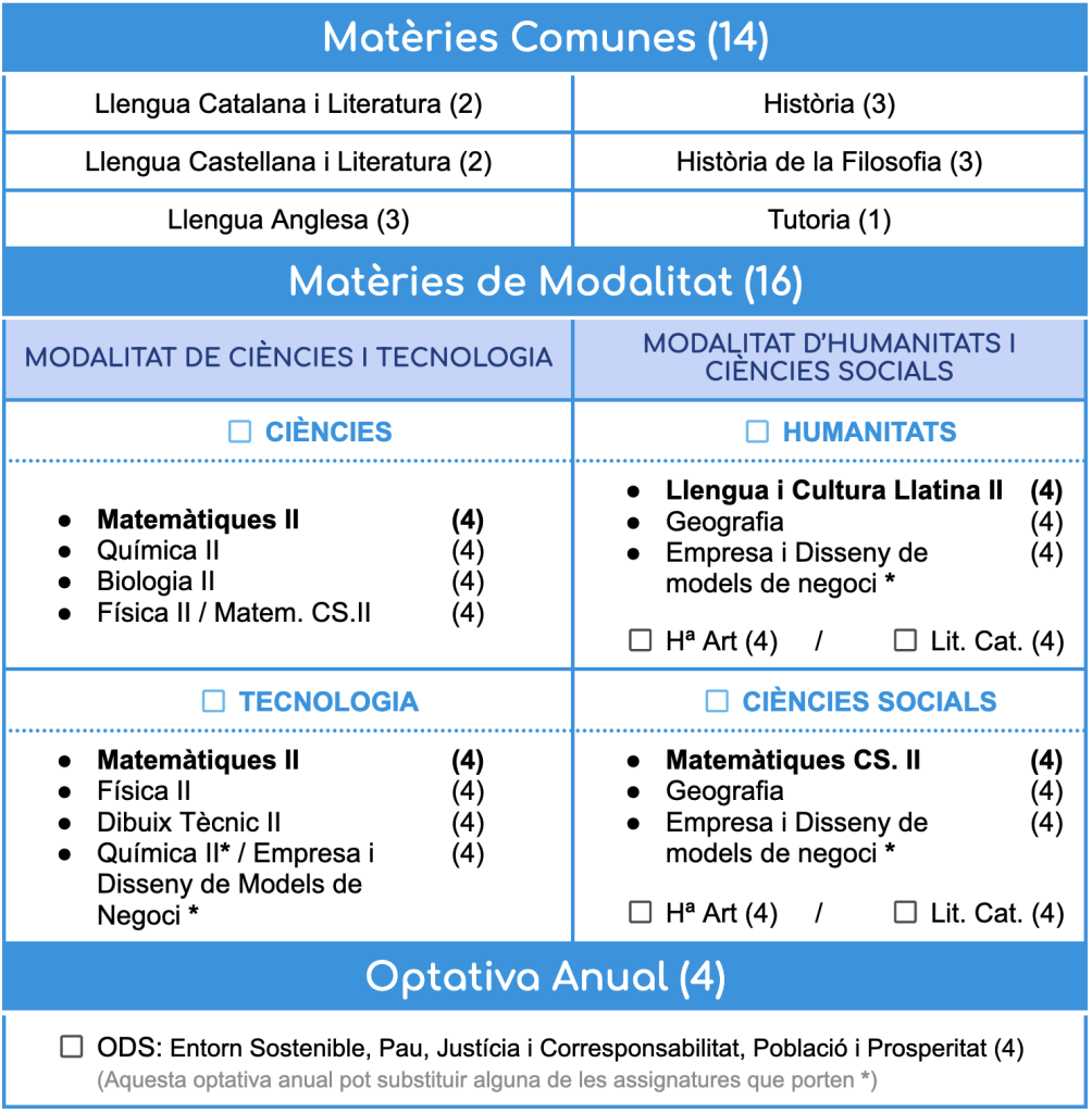 Les assignatures optatives de modalitat són l’espai ideal per a profunditzar, debatre i desenvolupar el pensament crític en un ambient de confiança i participació. Els grups entre 4 i 12 alumnes asseguren que cap dubte quedi sense resoldre, afavorint així que cada estudiant obtingui el seu màxim rendiment.